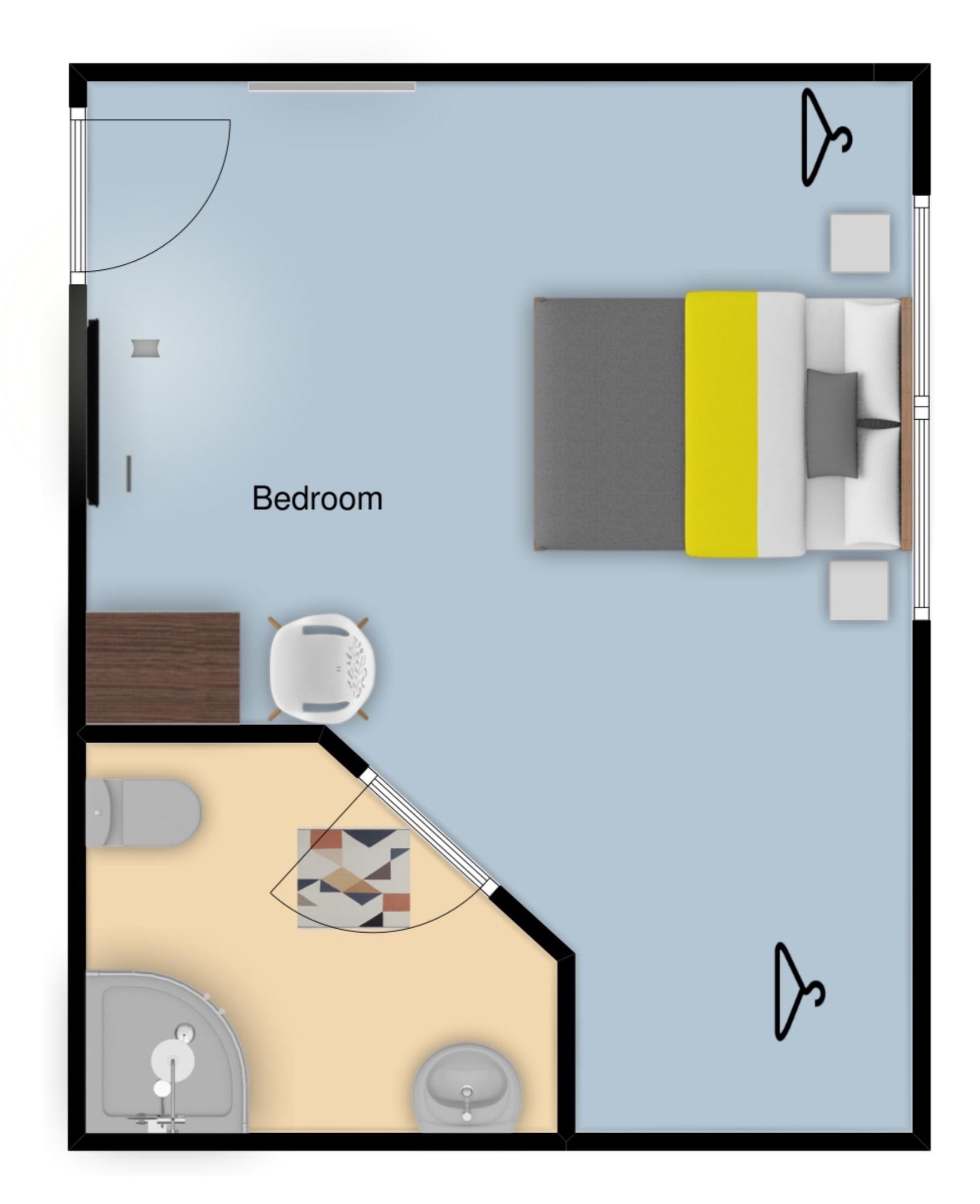 Small double room located in a Victorian terraced house, 5-minutes walk from main reception. Located on the top floor and accessible by stairs only. This room features an en-suite shower room and small flat screen TV.